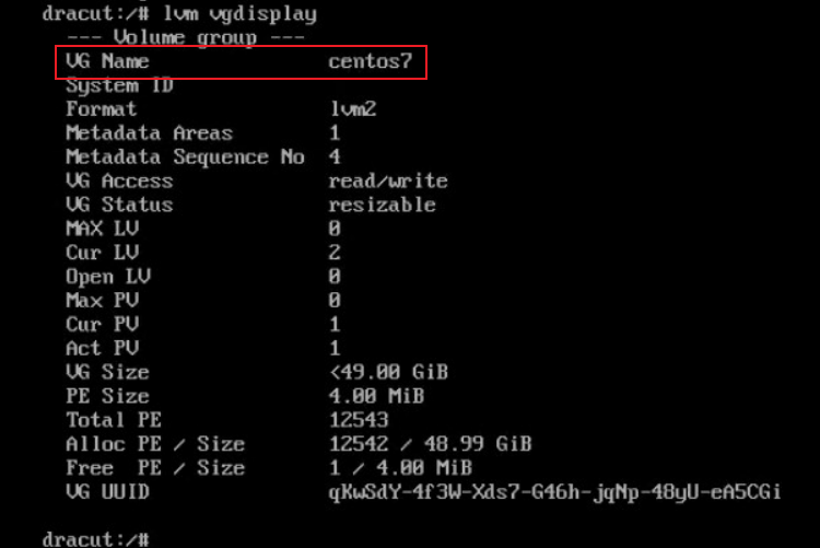 因为grub2引导文件中的路径仍然是旧VG名,启动时如图提示,报错 /dev/vgname/root does not exist: