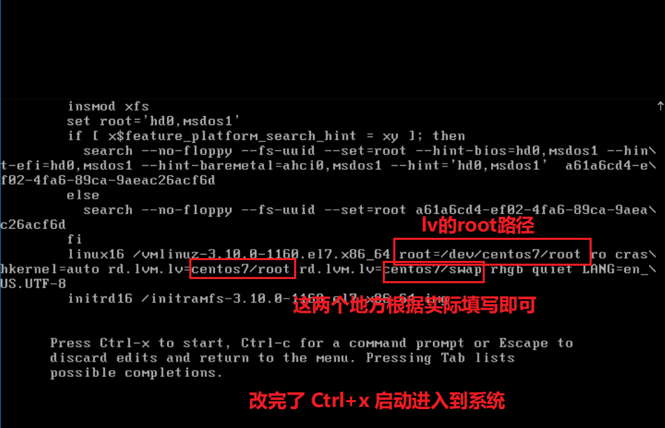 - 进入grub2临时启动菜单后,按照下图编辑参数: