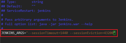 vim /etc/sysconfig/jenkinsJENKINS_ARGS="--sessionTimeout=1440 --sessionEviction=43200" #其中1440(60*24)为超时分钟数,即24小时;43200(60*24*30) 为session驱逐分钟数,即30天 #此变量中可以定义其他参数,例如: #JENKINS_ARGS="--webroot=/var/cache/$NAME/war --httpPort=$HTTP_PORT --sessionTimeout=1440 --sessionEviction=43200"- 重启Jenkins