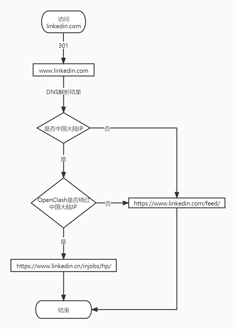 OpenClash的运行模式是 Redir-Host,没有开启「绕过中国大陆 IP」,自定义规则里追加了 - DOMAIN-SUFFIX,linkedin.com,PROXY,还是会重定向到 https://www.linkedin.cn/incareer/hp