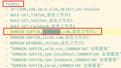 2、如果你自己写配置(或者订阅转换),把LinkedIn所有的域名都走代理