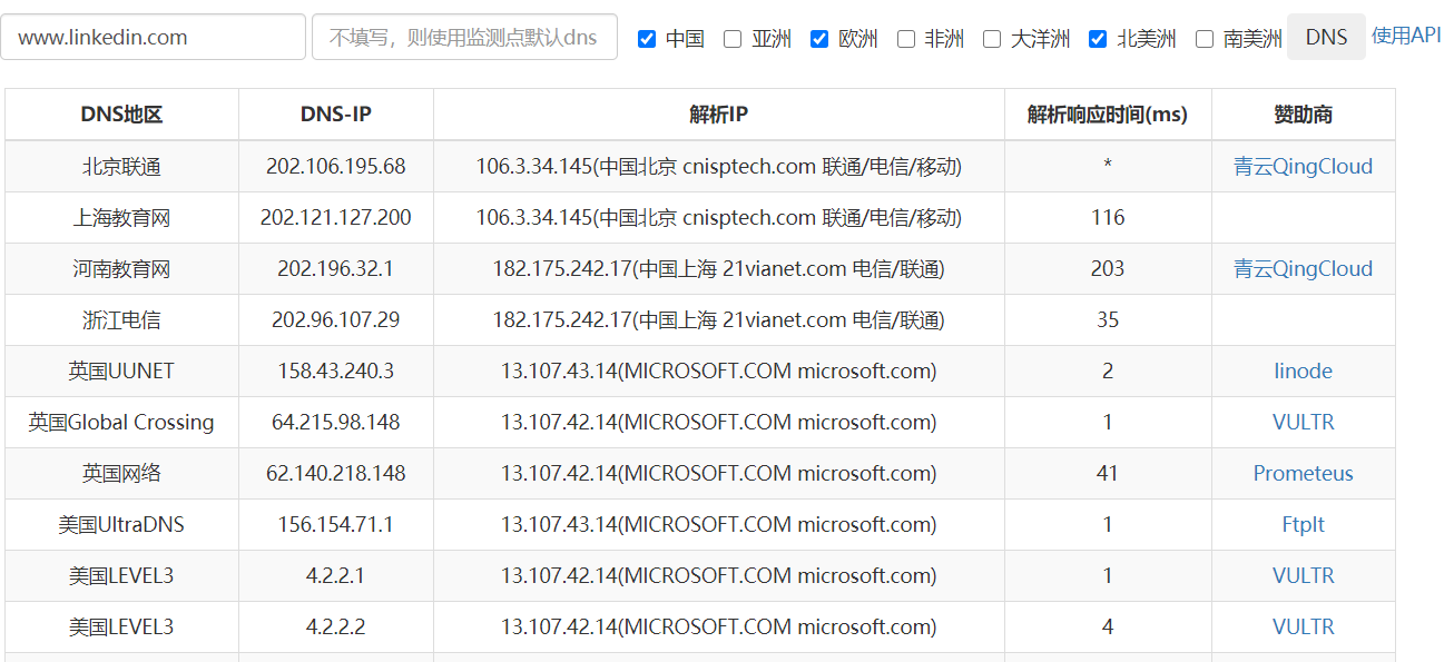 为了验证我的直觉,查询了大陆内外分别解析到www.linkedin.com的IP