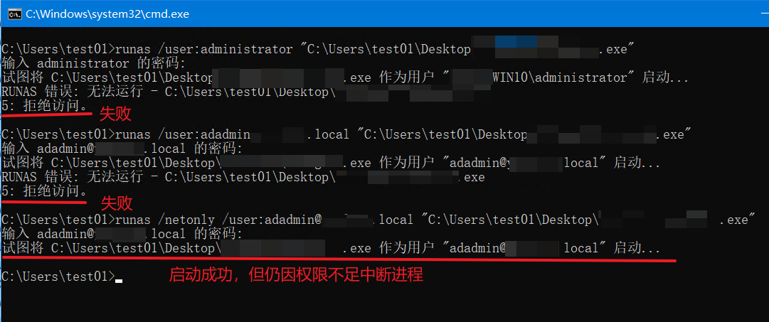 尝试了本地管理员和域管理员,皆失败,同样因为权限不够而中断进程