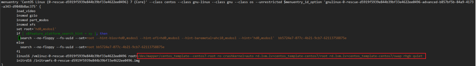 menuentry 'CentOS Linux (0-rescue-d5919f5939e844b39bf33e4622ee0496) 7 (Core)' --class centos --class gnu-linux --class gnu --class os --unrestricted $menuentry_id_option 'gnulinux-0-rescue-d5919f5939e844b39bf33e4622ee0496-advanced-b857bf5b-84a9-4173-a343-d9848b8ac375' { load_video insmod gzio insmod part_msdos insmod xfs set root='hd0,msdos1' if [ x$feature_platform_search_hint = xy ]; then search --no-floppy --fs-uuid --set=root --hint-bios=hd0,msdos1 --hint-efi=hd0,msdos1 --hint-baremetal=ahci0,msdos1 --hint='hd0,msdos1' bb5724e7-077c-4b21-9cb7-62113758875e else search --no-floppy --fs-uuid --set=root bb5724e7-077c-4b21-9cb7-62113758875e fi linux16 /vmlinuz-0-rescue-d5919f5939e844b39bf33e4622ee0496 root=/dev/mapper/vg001-root ro crashkernel=auto rd.lvm.lv=vg001/root rd.lvm.lv=vg001/swap initrd16 /initramfs-0-rescue-d5919f5939e844b39bf33e4622ee0496.img}修改完成之后保存,并重启,若能正常重启并登录系统,本次修改就是成功了。